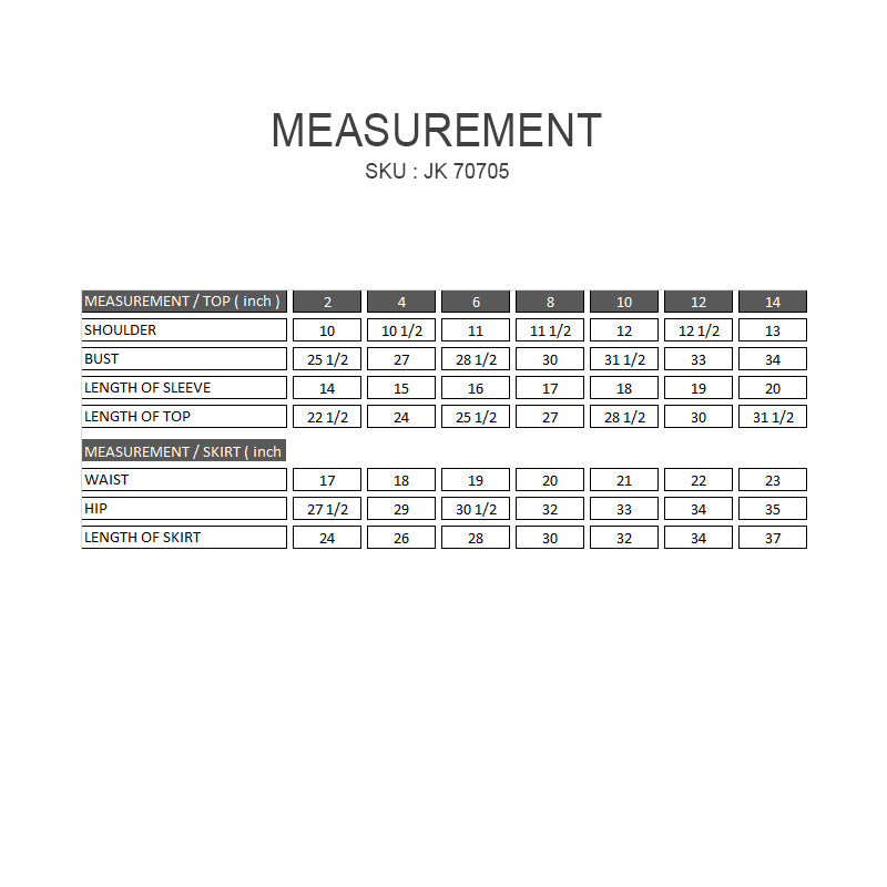 Comes in 7 sizes : 2,4,6,8,10,12,14